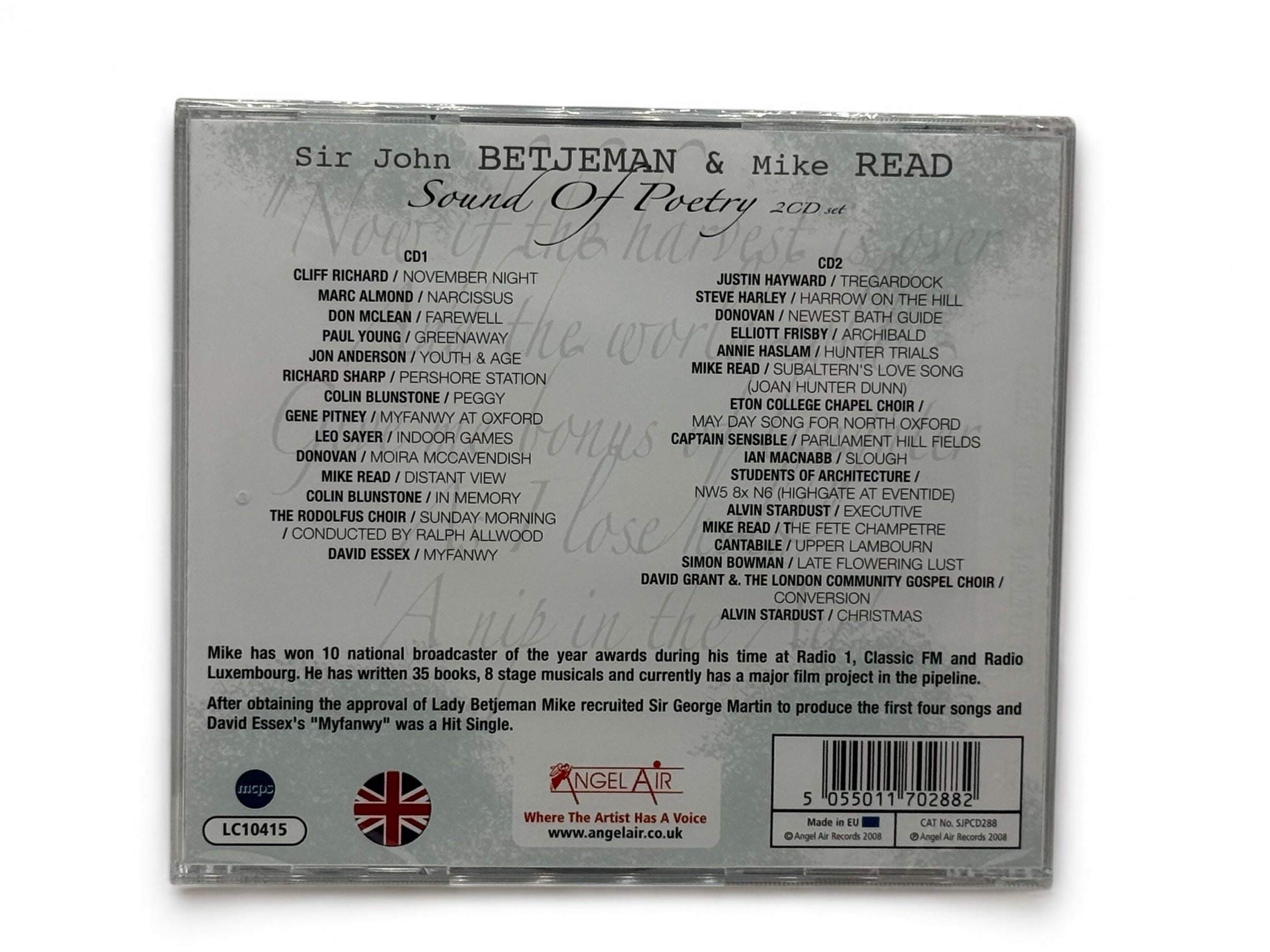 Sound of Poetry is a heartfelt musical tribute to the late Sir John Betjeman, curated and produced by broadcaster and musician Mike Read. Inspired by melodies that emerged while reading Betjeman’s verse, Read composed music to accompany the poems, enlisting a remarkable lineup of artists to interpret them. The project received early support from Lady Betjeman and legendary producer Sir George Martin, with contributions from Rod Edwards and Jon Sweet across the two discs.